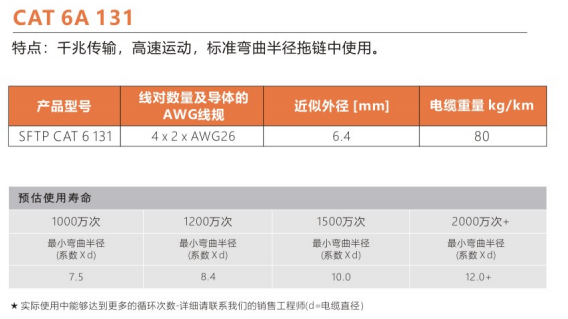 彎曲半徑 : 非拖鏈內運動:6.0X電纜外徑